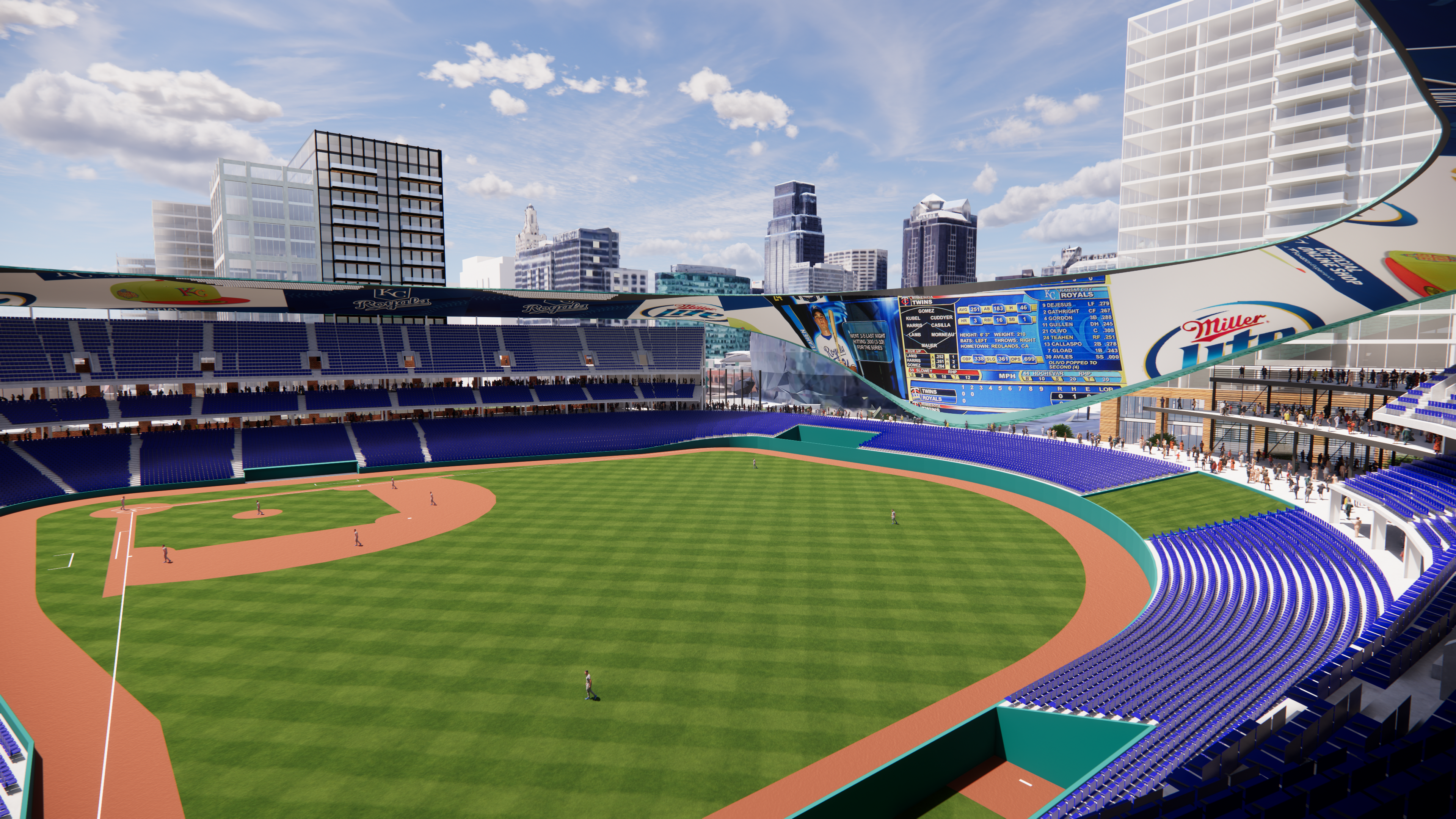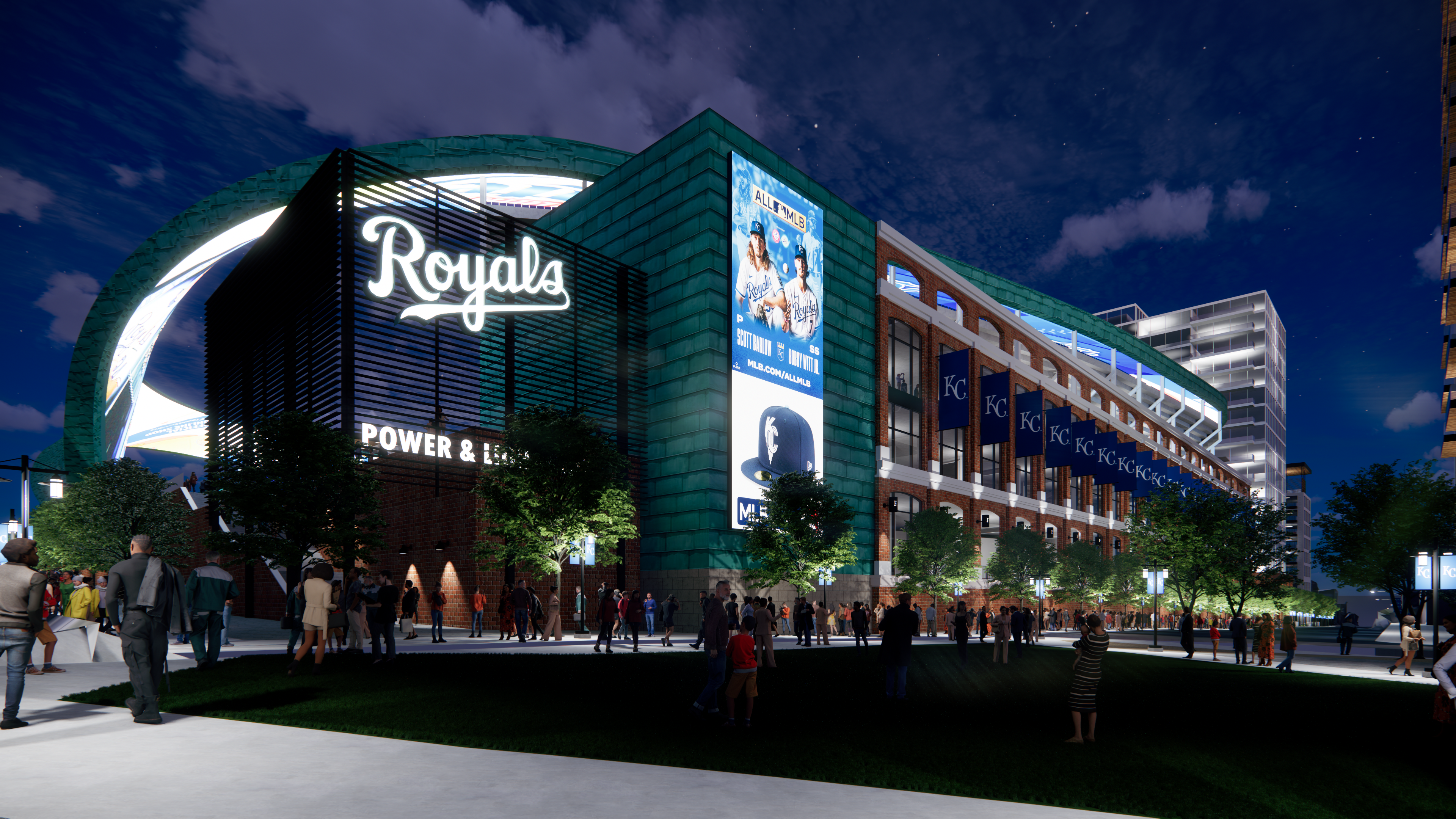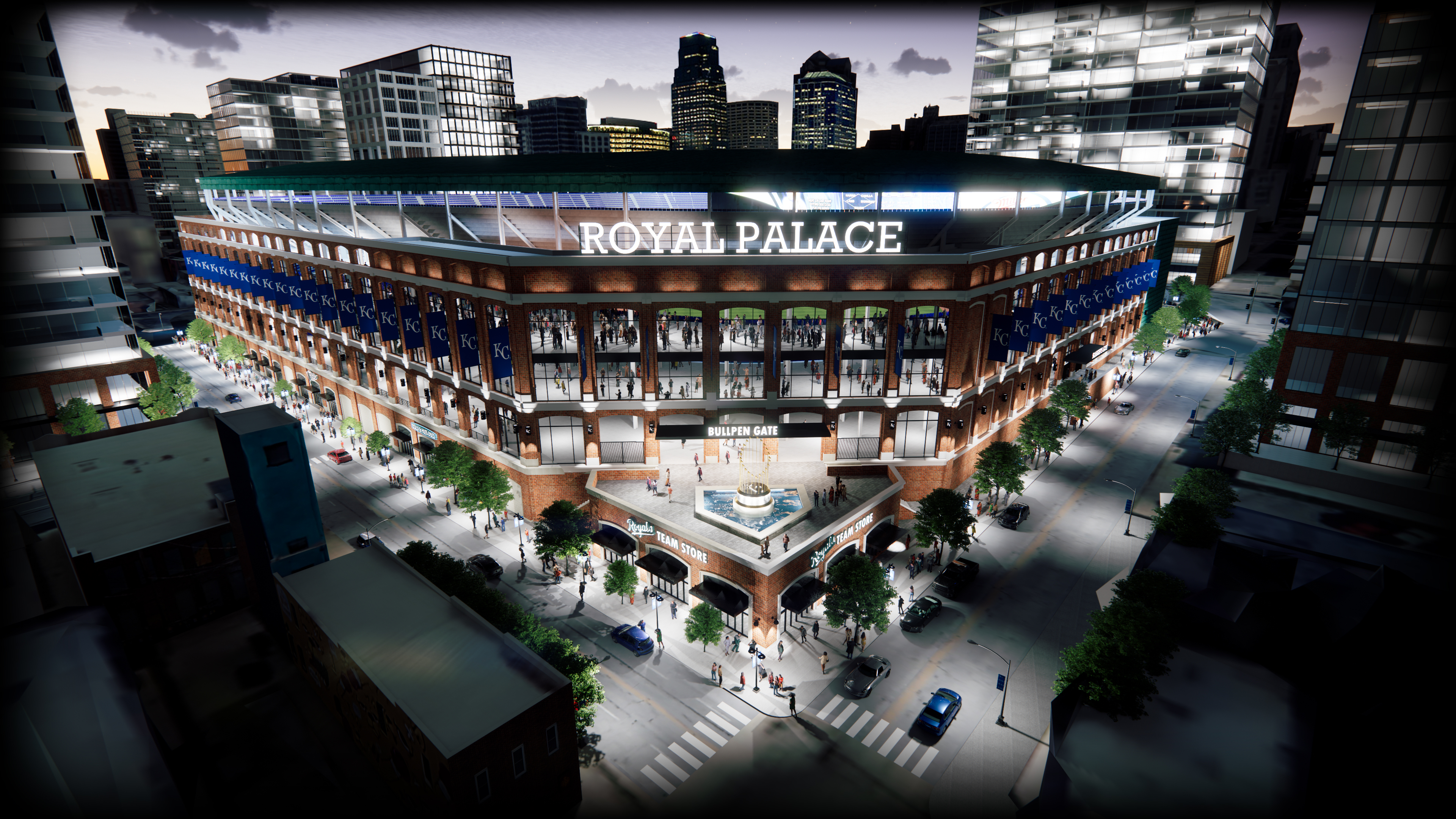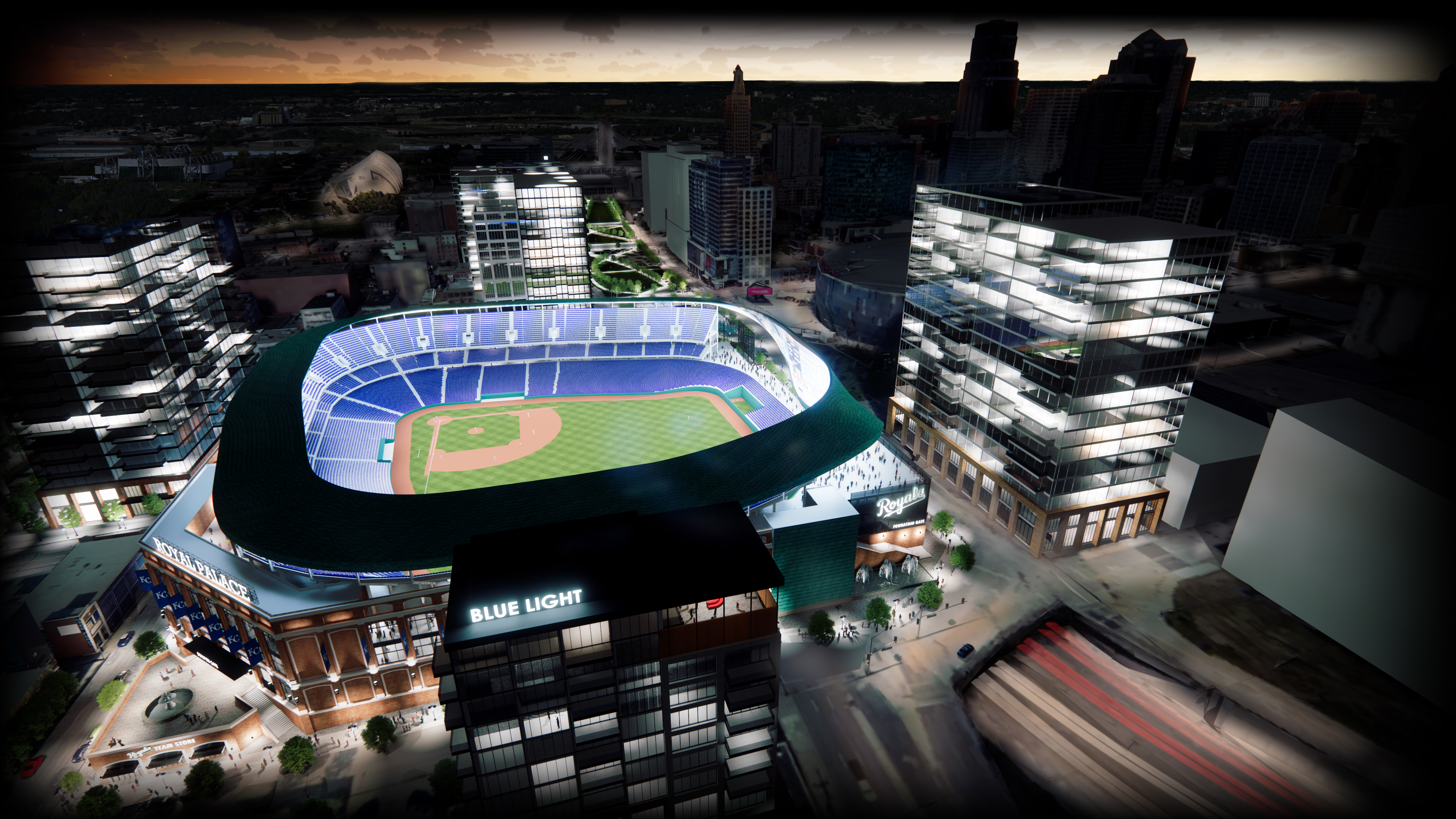 The stadium design emanated from the field of play which took its shape from the existing field at Kauffman Stadium. The red brick facade echoes the historic stockyard warehouses of Kansas City’s west bottoms while the copper clad overhead canopy structure and circulation towers were planned to be skinned with cladding from the iconic Kansas City Star building currently perched at the site.