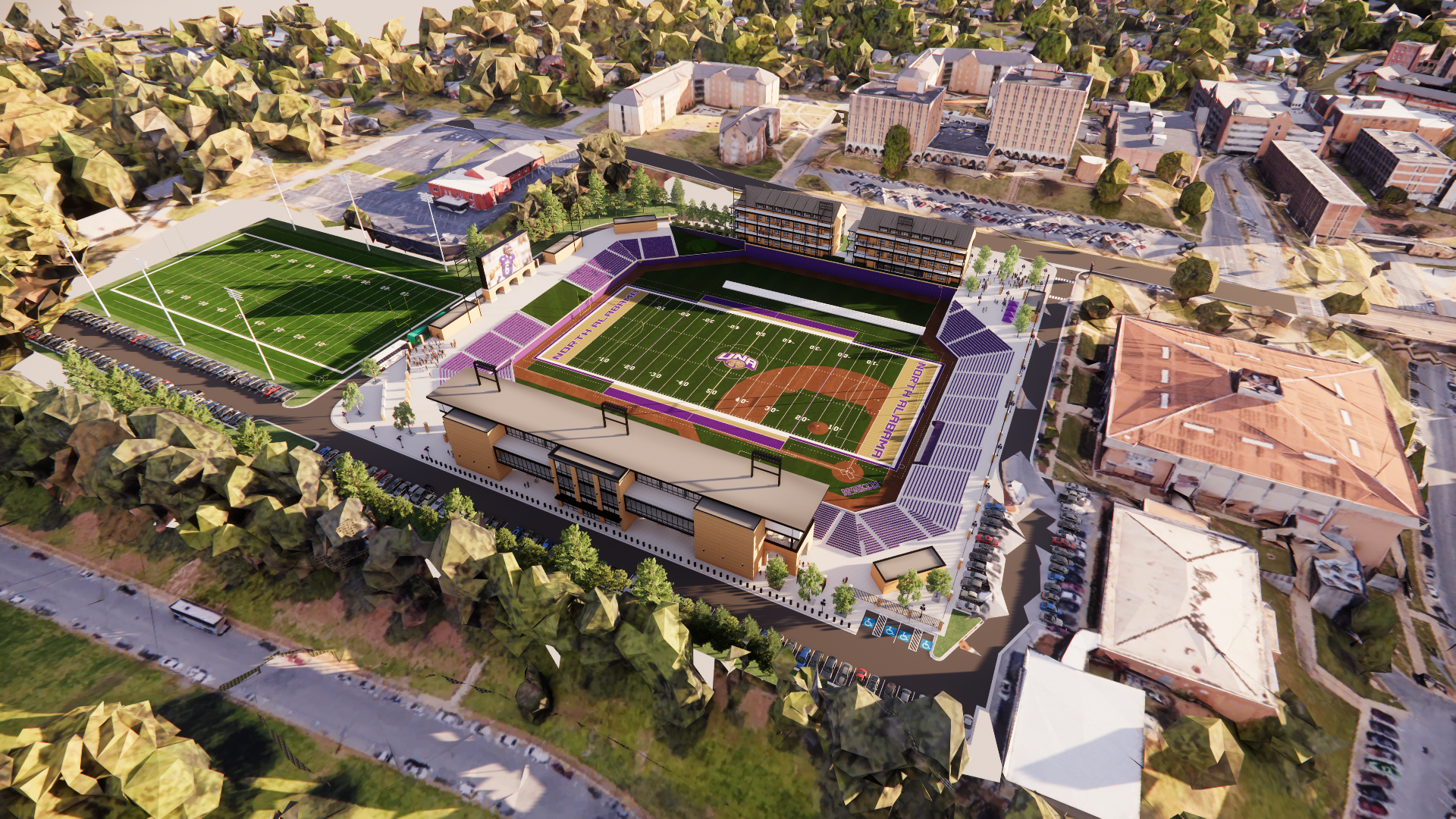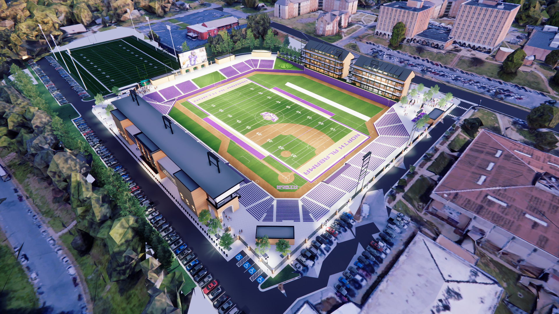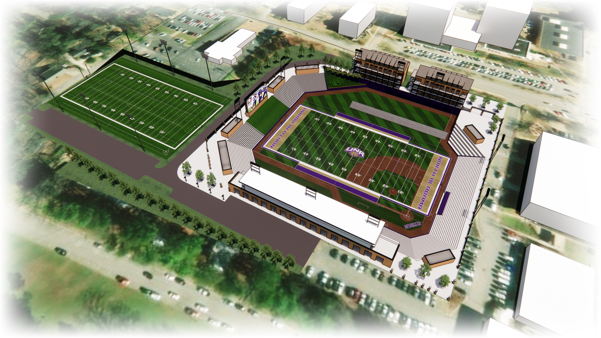 After realizing the university’s tenancy situation created less than an ideal opportunities for improvements, the initial ask was to ascertain if it was possible to build a new football stadium to the heart of the UNA campus directly adjacent to the existing baseball stadium and basketball arena, creating a campus athletic district. The programmatic spaces initially identified were a new stadium for football with premium spectator options, Student athlete weight training amenities and additional student accommodations desperately needed on campus.